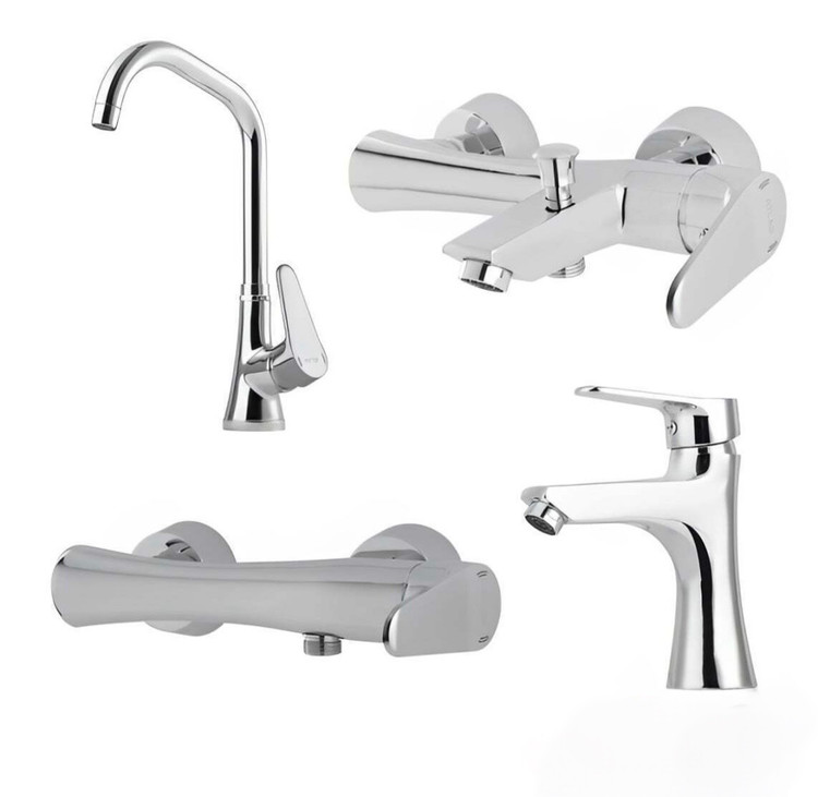 این ست کامل شامل شیر ظرفشویی، حمام، توالت و روشویی با طراحی مدرن و بدنه تمام برنجی است که با آبکاری کروم درجه یک پوشانده شده است.